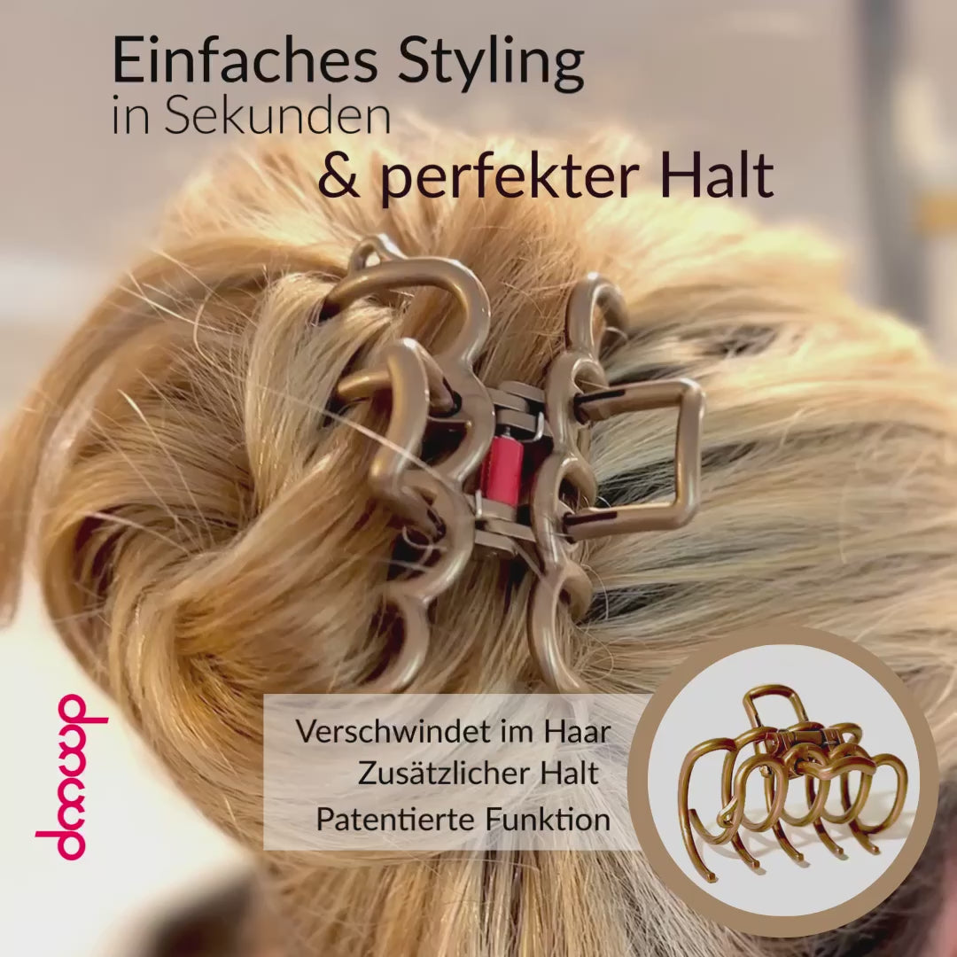 Die doouup® zeichnet sich durch ihre einzigartigen, patentierten Einschiebebügel aus. Ursprünglich war unser Ziel, die Öffnungselemente zu verbergen, um sie nahezu unsichtbar im Haar verschwinden zu lassen. Zusätzlich mit dieser Innovation fixieren die eingeschobenen Bügel wie zusätzliche Haarnadeln und geben den ganzen Tag einen sicheren Halt.