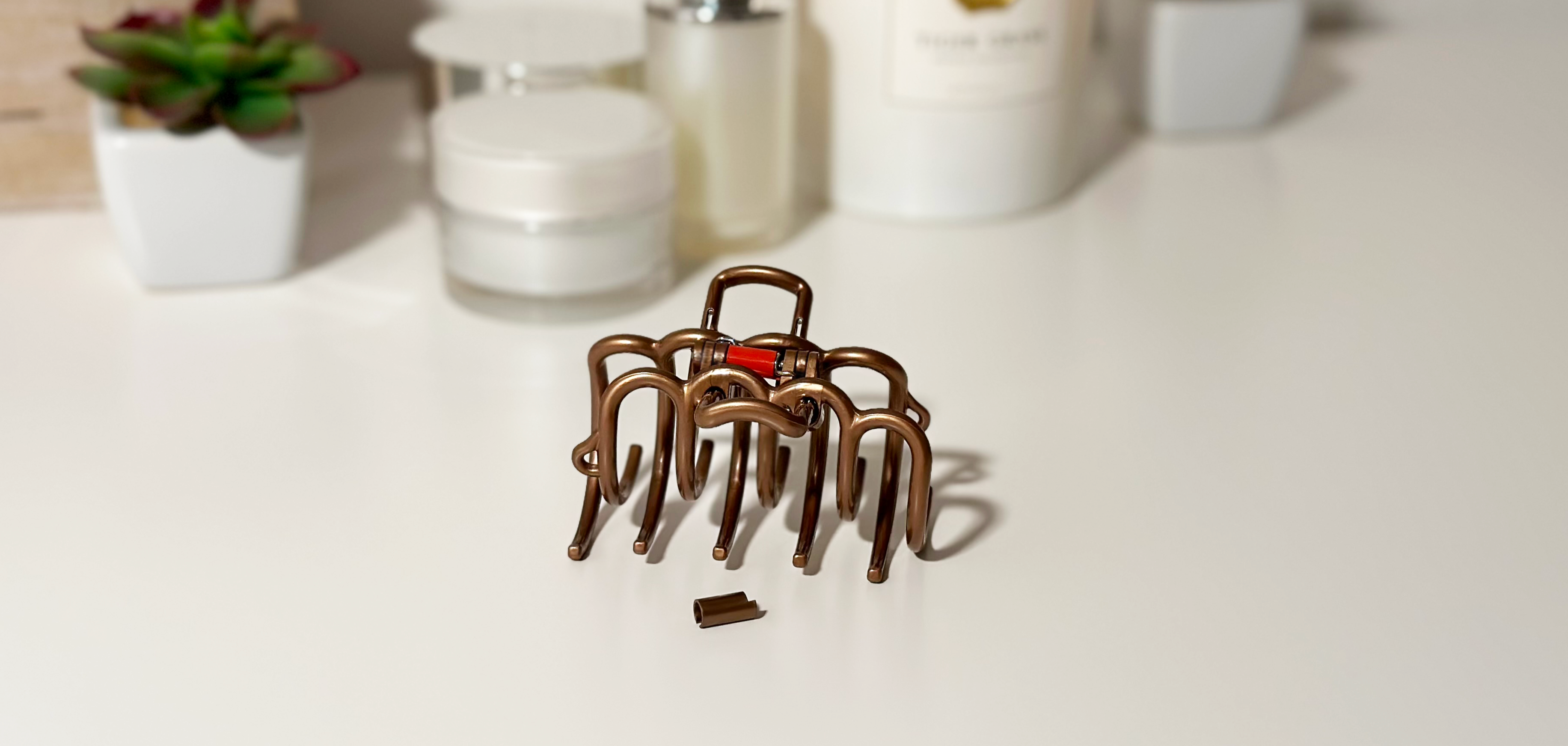 Wir verwenden einen sehr hochwertigen, teuren Kunststoff, damit lässt sich die filigrane Form in einem aufwendigen Verfahren produzieren. Die doouup ist in allen Teilen, von den Kunststoffteilen über den Bolzen und die Feder bis zur Verpackung in Deutschland produziert. Sie ist damit, obwohl sie aus Kunststoff ist, sehr nachhaltig: sie kennt nur kurze Wege und muss nicht um die halbe Welt und durch das hochwertige Material ist sie sehr langlebig. Es gilt das Motto - nur eine doouup statt vieler Haarklammern. Und natürlich sind ihre Bügel ganz besonders - nur die doouup hat die patentierten Bügel, die den ultimativen Halt geben. Das alles macht sie auch nicht vergleichbar mit den Haarklammern aus der Drogerie.
